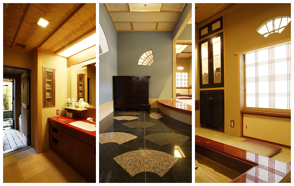 A separate room features a kujyotsuchi wall of brilliant cobalt blue and a zougan sunken fireplace framed in wood decorated with intricate inlay of fan motifs.