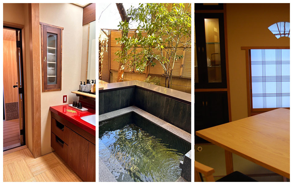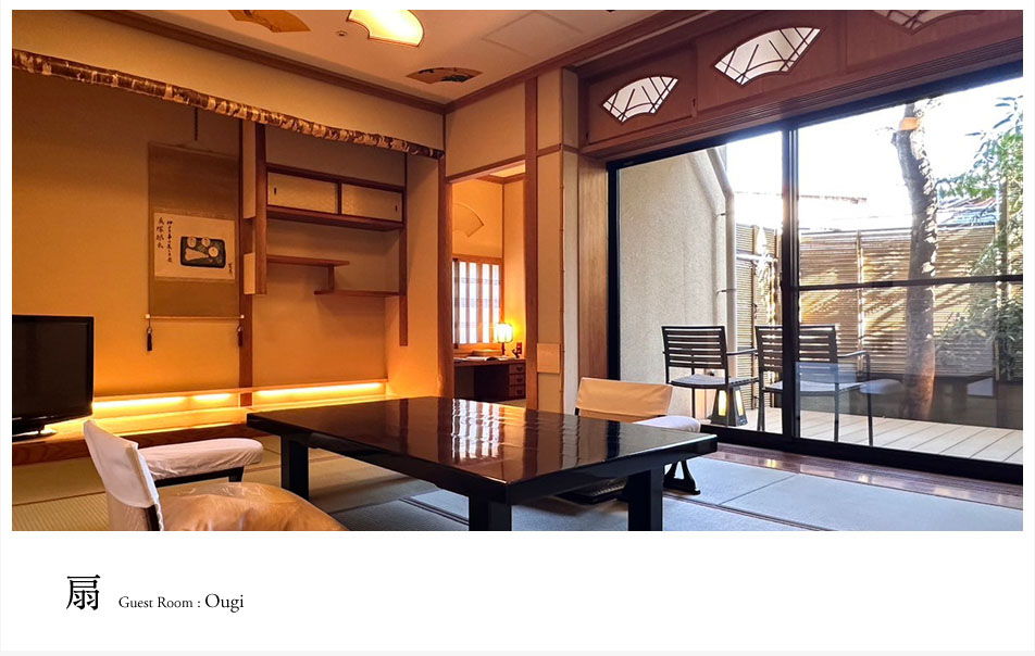 設備 | テレビ42型1台・電話・冷蔵庫・洋式トイレ(ウォシュレット)・露天風呂・ドライヤー・加湿空気清浄機・浴衣・作務衣・半纏・雪駄・ポット・布巾・湯呑・急須・お茶葉・楊枝・お皿・割り箸・コップ・グラス・シャンパングラス・栓抜き・爪切り・小物入れ |